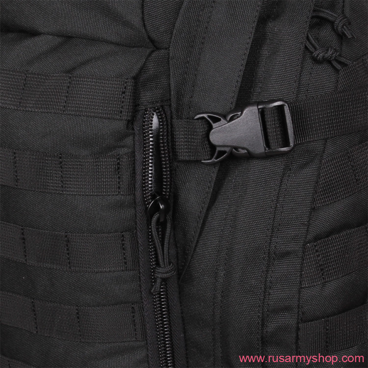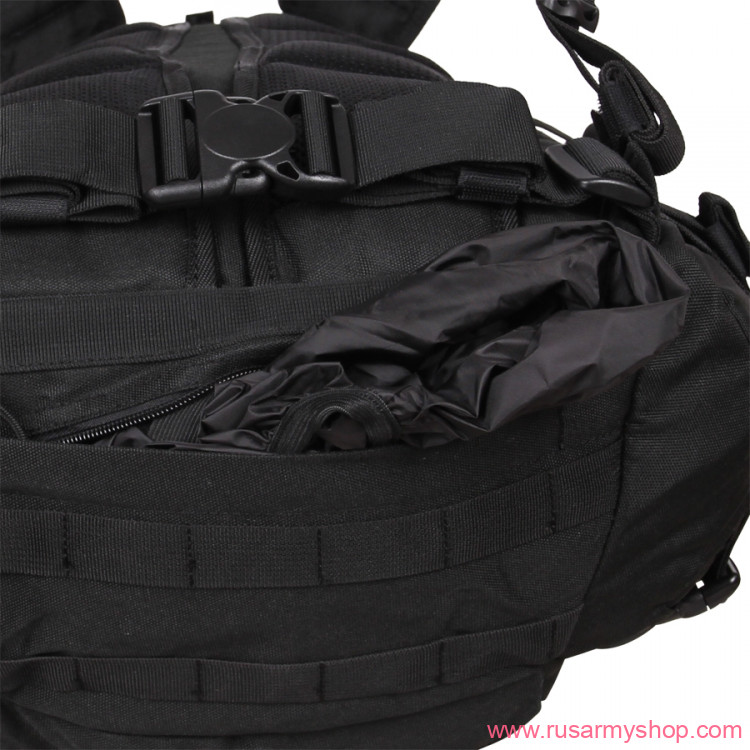 Large outer bottom pocket, side entry with vertical zip. The outer surface is sheathed with PALS / MOLLE slings, 6 cells in width, 6 rows of slings in height
